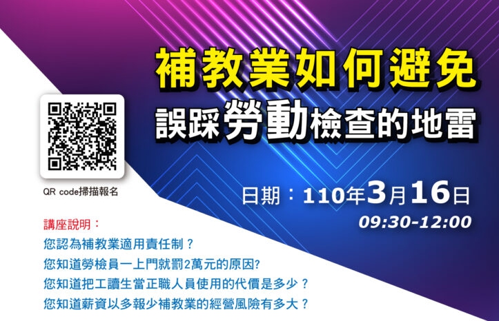 ?您認為補教業適用責任制??您知道勞檢員一上門就罰… Read More »2021您最應該關心的議題 #補教業如何避免誤踩勞動檢查的地雷!