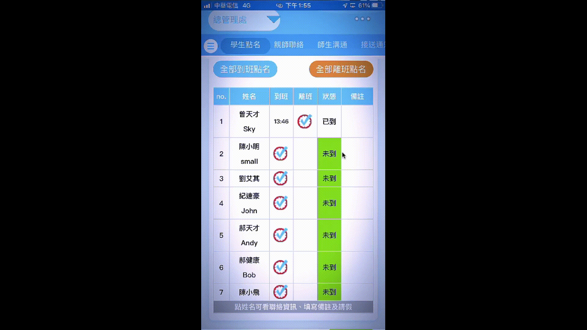 學生到校之後通過”刷卡機”、”指紋機”、”臉部辨識儀”等系統打卡,確認到班後系統將自動將孩子到校資訊紀錄於系統中,老師也可以手動使用系統後台或著是手機APP點名,老師只要開啟系統後台或著是手機APP點名即可清楚了解班級孩子的到班狀態,如有孩子時間到尚未到校,也可以利用系統中的”親師聯絡”訊息功能,馬上與家長聯繫確認孩子的狀況,讓老師安心、家長放心。